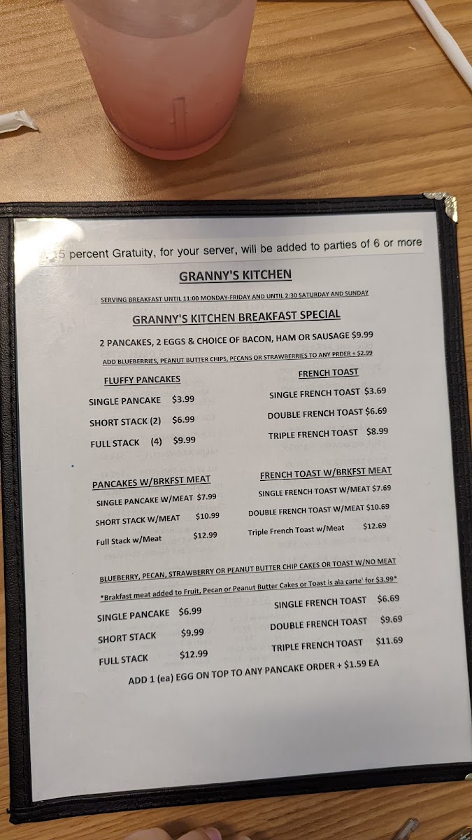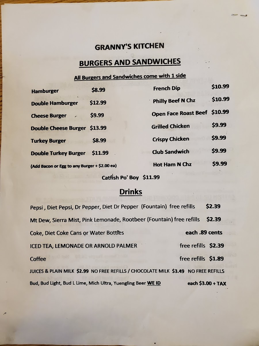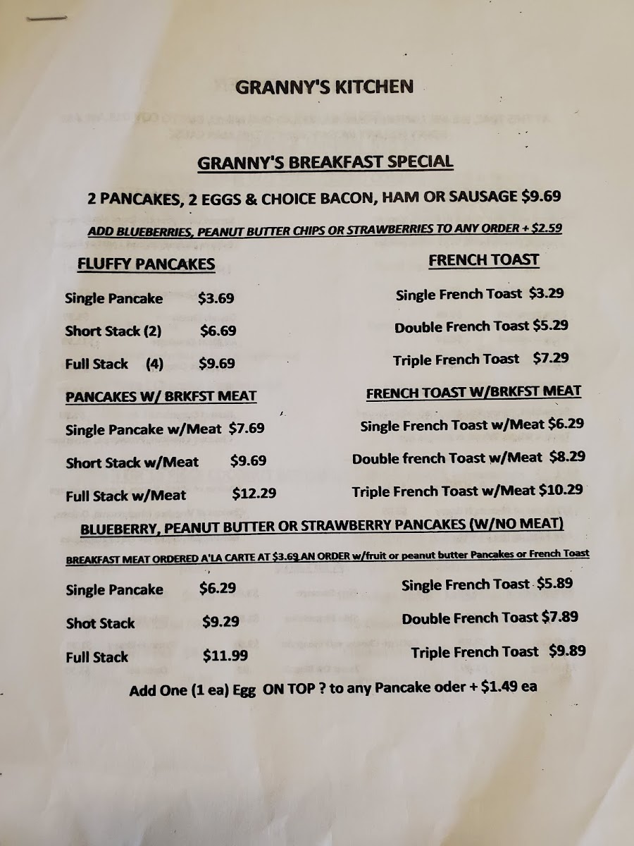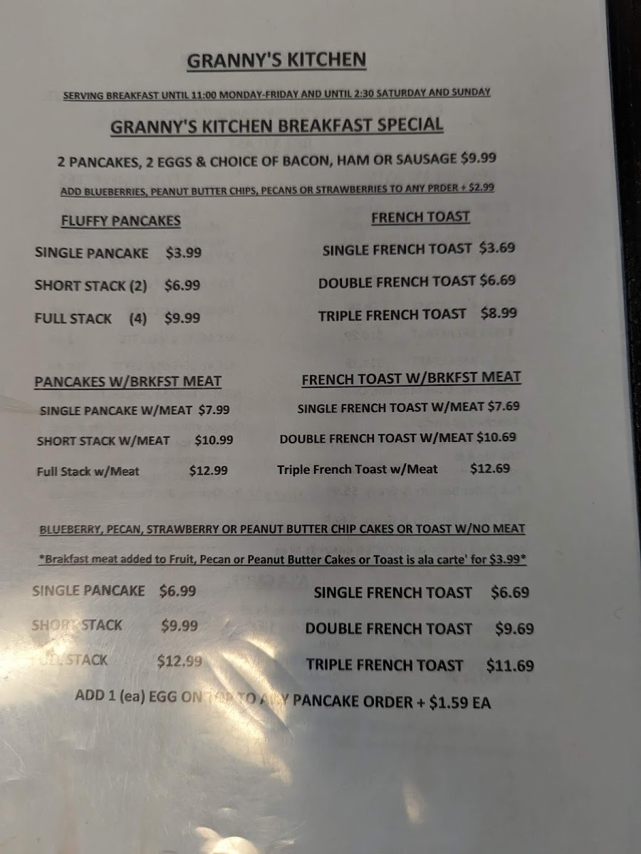 Granny's Kitchen offers a straightforward, comforting menu that blends classic American diner fare with a cozy, home-style touch. Whether you're stopping by for a hearty breakfast or a casual lunch, the selection invites you to enjoy simple, satisfying dishes in a relaxed setting.